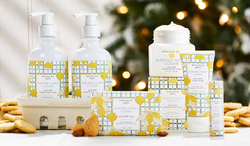 Collection shot of Beekman 1802's Almond honey Cookie bodycare products surrounded by cookies and a christmas tree in the background.