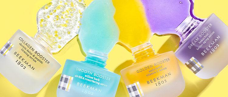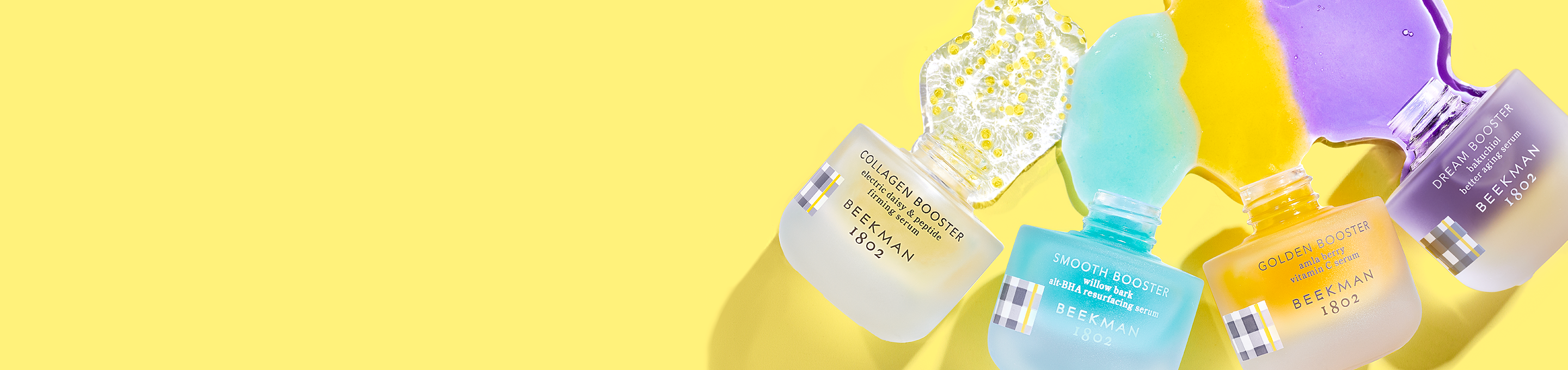 4 Bottles of Beekman 1802's Booster Serums which includes Collagen, Smooth, Golden, and Dream, all tipped over and with product spilling out on yellow background.