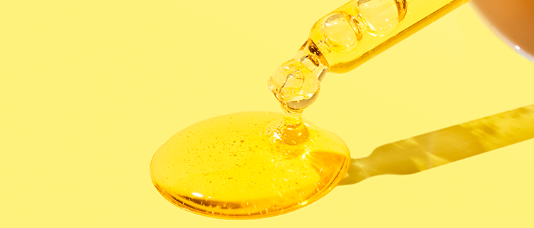 Closeup shot of serum dropper from Beekman 1802's Golden Booster Vitamin c & amla berry Brightening Serum, dropping orange serum onto the yellow ground.