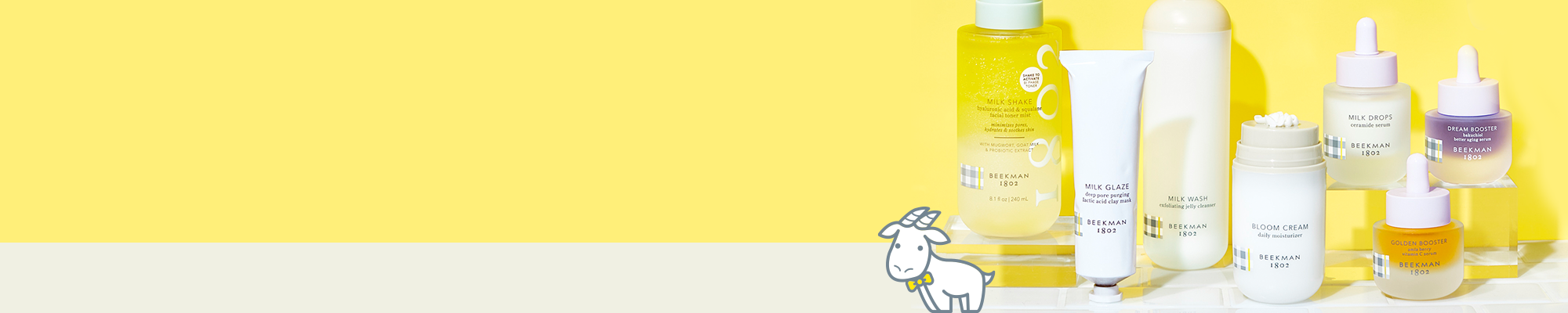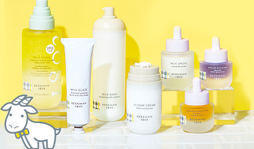 Bottles of Beekman 1802's Clinically Kind Skincare all lined up next to each other on white tile, to the far right of the image on a yellow background, with a cartoon goatie standing next to the bottles.