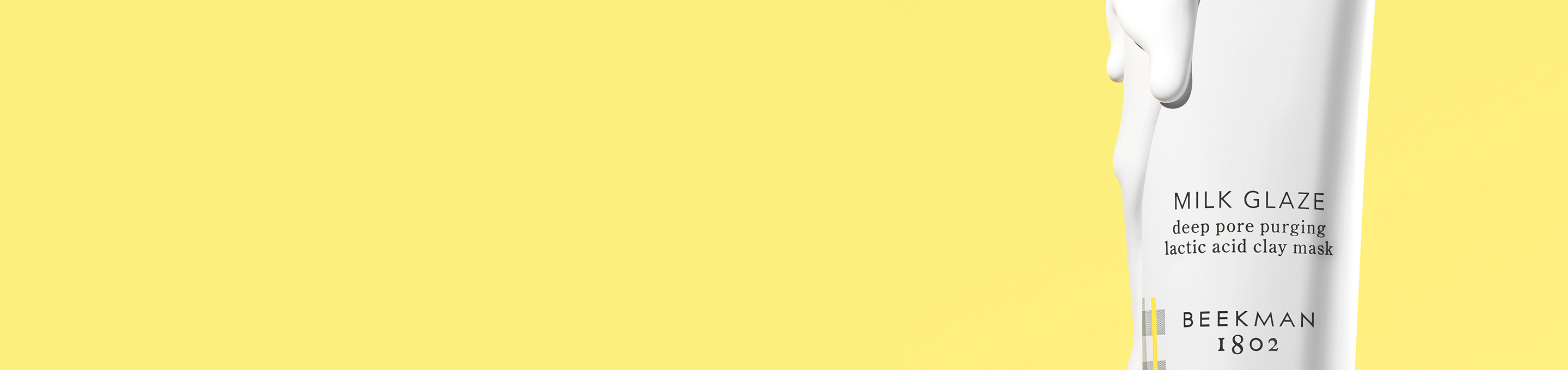 Up close image of Beekman 1802's Milk Glaze Deep Pore Purging Lactic Acid Clay Mask to the far right of the image, with product dripping down the tube and on a yellow background.