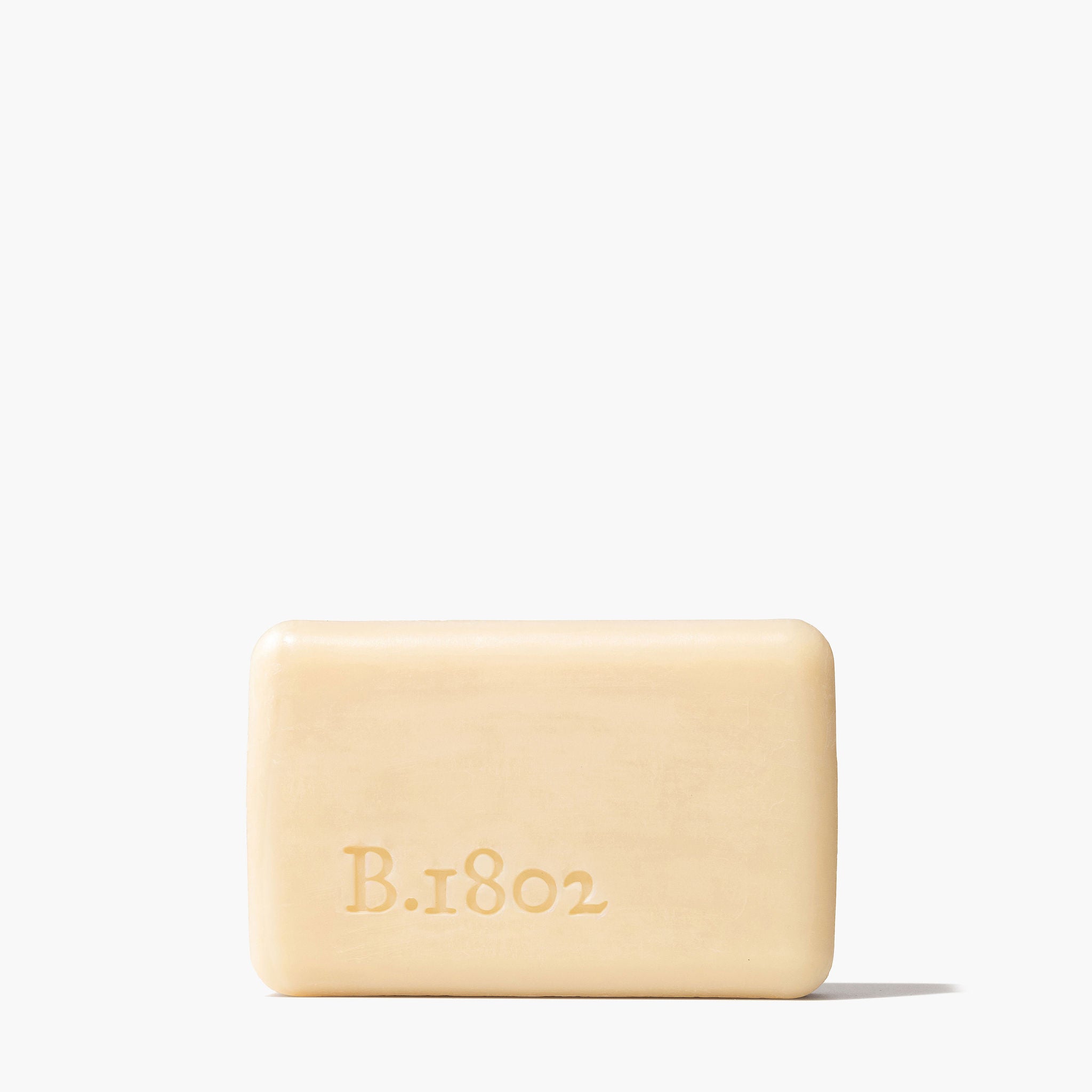 Unwrapped bar of Beekman 1802's Lilac Dream Goat Milk Soap, which has the word "B.1802" stamped on the bottom left of the soap, standing on a white background.