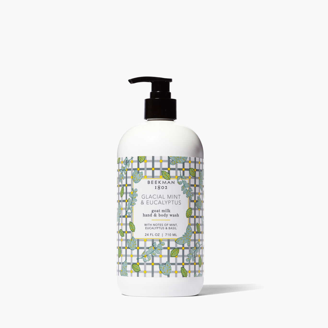 Bottle of Beekman 1802's Glacial Mint & Eucalyptus Hand & Body Wash standing on a white background.