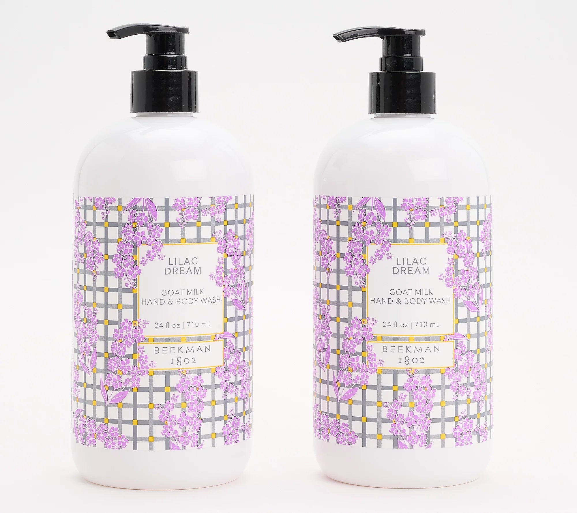 white Bottle of Beekman 1802's Lilac Dream Hand & Body Wash with with gingham label designed with lilac flowers and a white nozzle on top, standing on a white background.