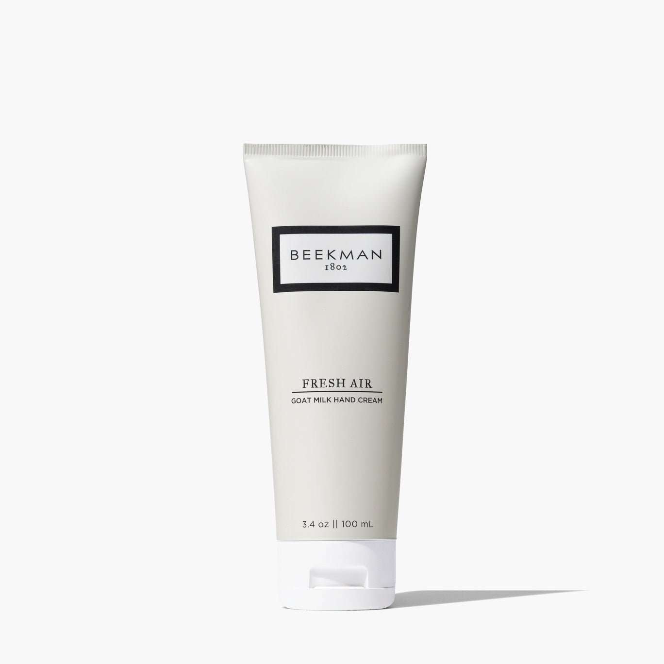Tube of Beekman 1802's Fresh Air Hand Cream with white cap, standing on a white background.
