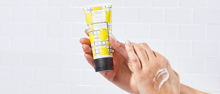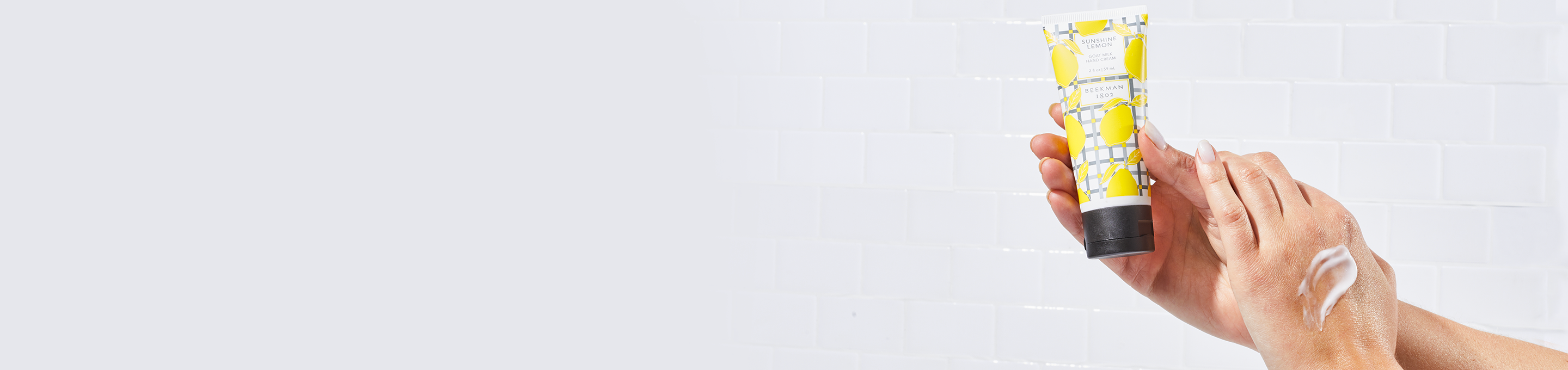 Up close shot of hand holding a tube of Beekman 1802's Sunshine Lemon Hand Cream, with other hand propped up showing the cream applied on the back of the hand, on a white tile background on the far right of the screen.