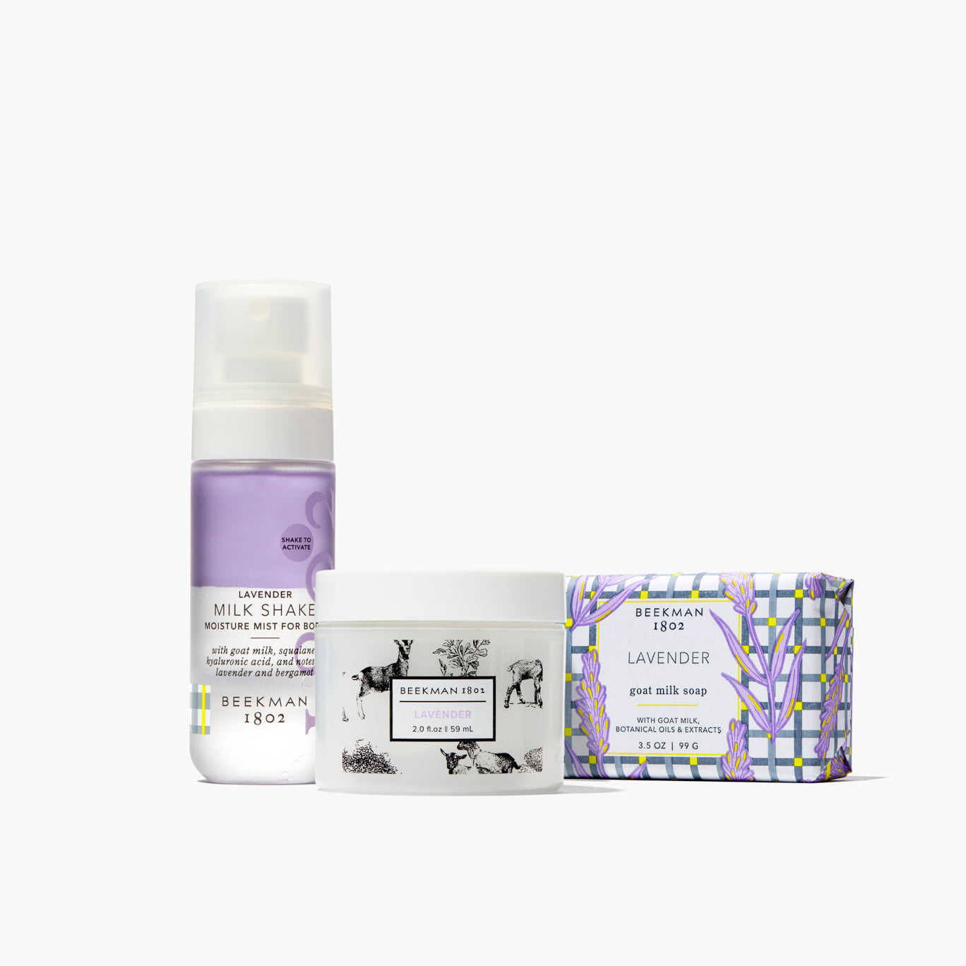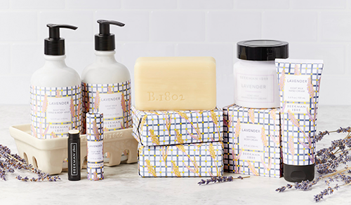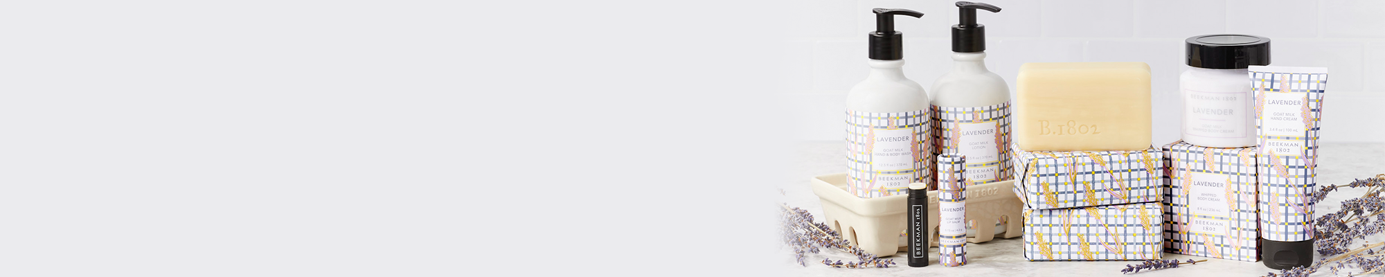 Products from Beekman 1802's Lavender Collection which includes the caddy set, lip balm, bar soap, body cream and hand cream all displayed next to each other on the far right side of the screen, surrounded by lavender flowers on a light grey tile background.