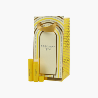 Small Tube of Beekman 1802's Pure Goat Milk Lip Balm in gingham packaging with a yellow cap to the far right of the screen, on top of lip balm ingredient smear on a yellow background.