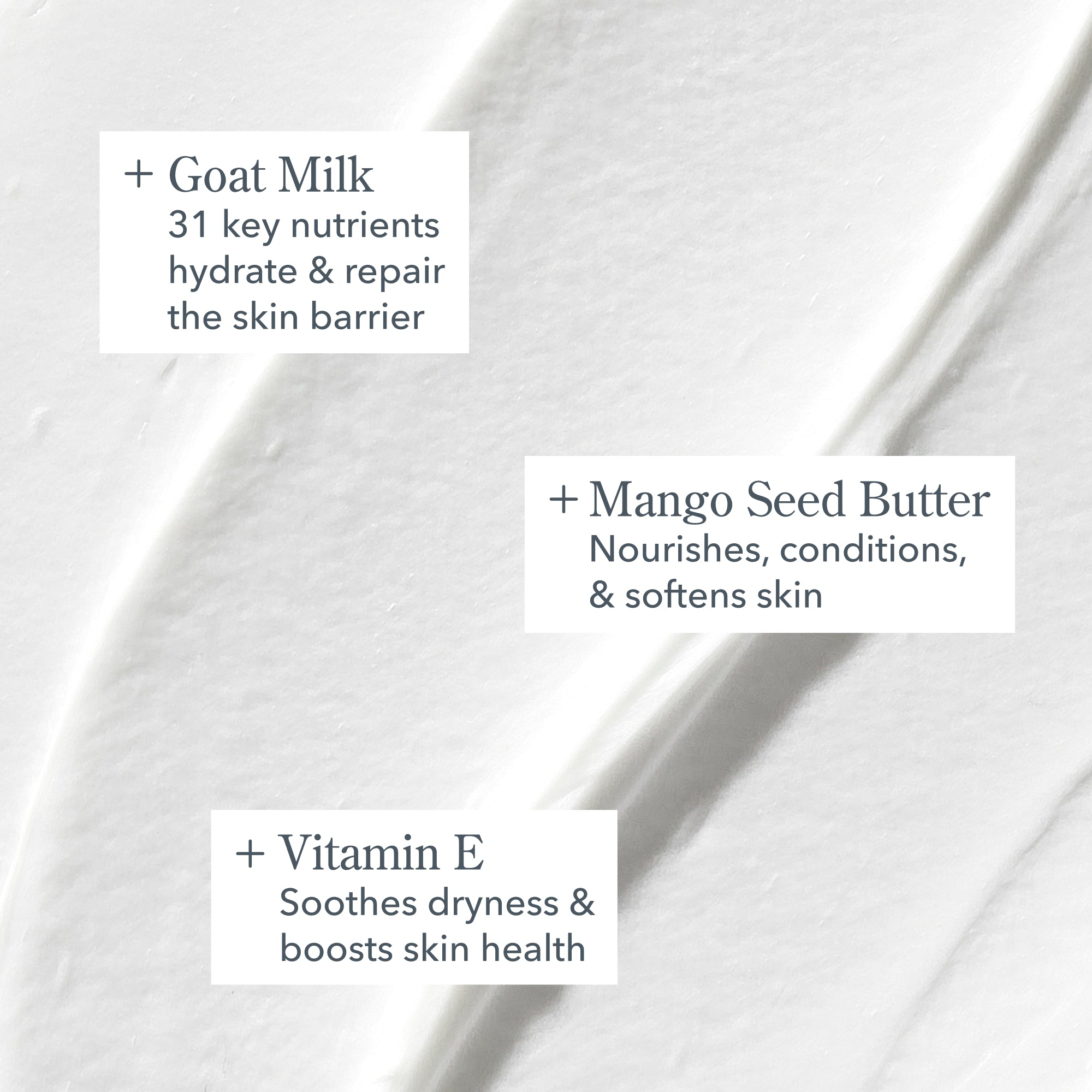 Water (Aqua), Glycerin, Cocos Nucifera (Coconut) Oil, Elaeis Guineensis (Palm) Oil**, Ethylhexyl Palmitate, Stearic Acid, Stearyl Alcohol, Dimethicone, Mangifera Indica (Mango) Seed Butter, Theobroma Cacao (Cocoa) Seed Butter, Persea Gratissima (Avocado) Oil, Butyrospermum Parkii (Shea) Butter, Argania Spinosa (Argan) Kernel Oil, Simmondsia Chinensis (Jojoba) Seed Oil, Rosa Canina (Rose Hip) Seed Oil, Aloe Barbadensis Leaf Juice, Caprae Lac (Goat Milk), Camellia Sinensis (Green Tea) Leaf Extract*, Vitis Vinifera (Grape) Seed Extract*, Vaccinium Myrtillus (Bilberry) Fruit Extract*, Silybum Marianum (Milk Thistle) Extract*, Ginkgo Biloba Leaf Extract*, Pinus Pinaster Bark (Maritime Pine) Extract, Tocopherol (Vitamin E), Ascorbyl Palmitate, Acrylates/C10-30 Alkyl Acrylate Crosspolymer, Ethylhexylglycerin, Phenoxyethanol, Xanthan Gum, Ceteareth-25, Tetrasodium EDTA, Sodium Hydroxide, Fragrance (Parfum) ... and Kindness. *Certified Organic **Sustainable Source, RSPO Certified